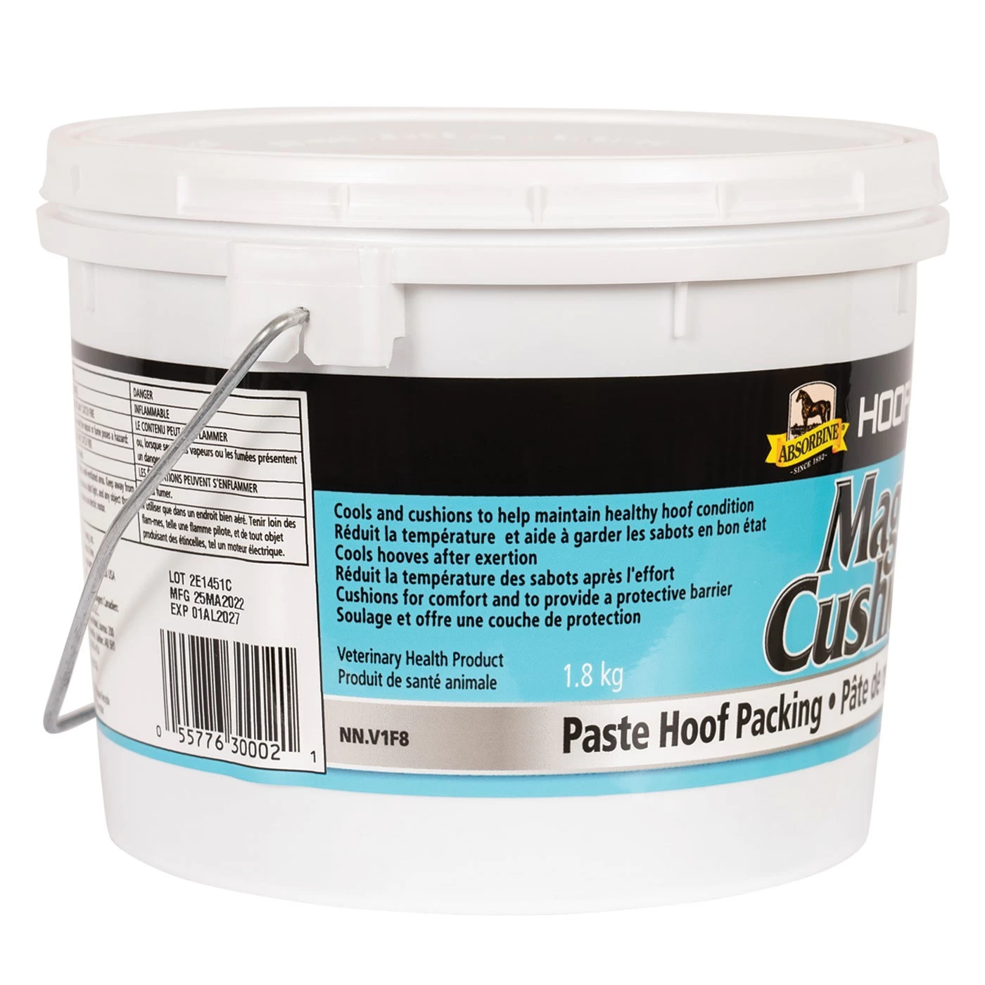 Magic Cushion is my go-to hoof packing. It keeps my horses comfortable and performing at their best. – Ian Millar, International Show Jumping Champion. Veterinary-formulated to work like magic on tired feet, Magic Cushion® hoof packing starts working to reduce hoof heat within one hour, and then for up to 24 hours. The cooling and cushioning action provides fast, soothing relief for hard-working hooves and each four-pound tub offers great value, containing enough hoof packing for about 20 applications! It is one of the top 5 products recommended by farriers to clients according to the 2014 American Farriers Journal Business Practices Survey.