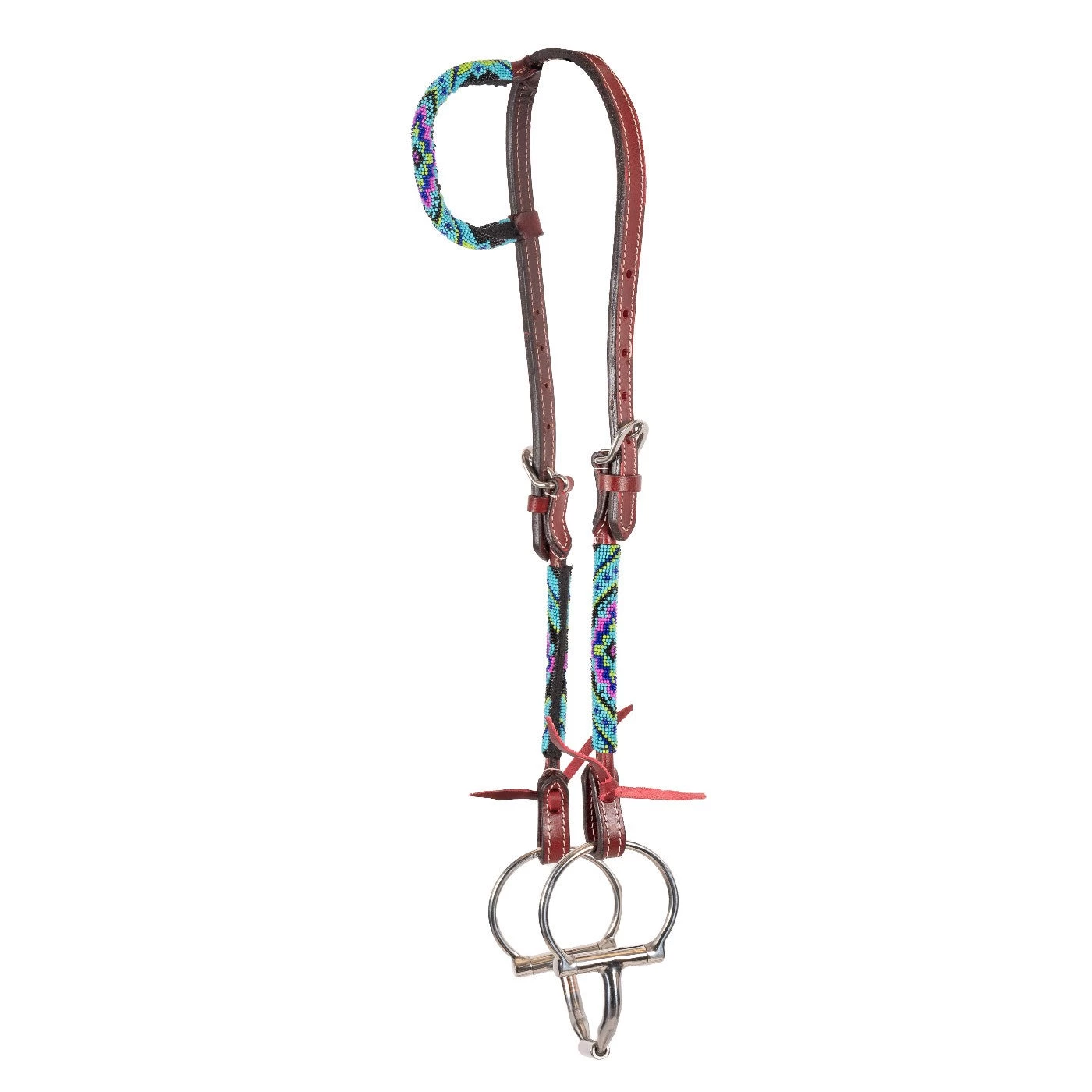 The Beaded Diamond Ear Headstall offers a supple, latigo leather headstall with a single ear construction. Complete with a hand beaded wrap on the cheeks and ear in a custom diamond design. Bit not included.