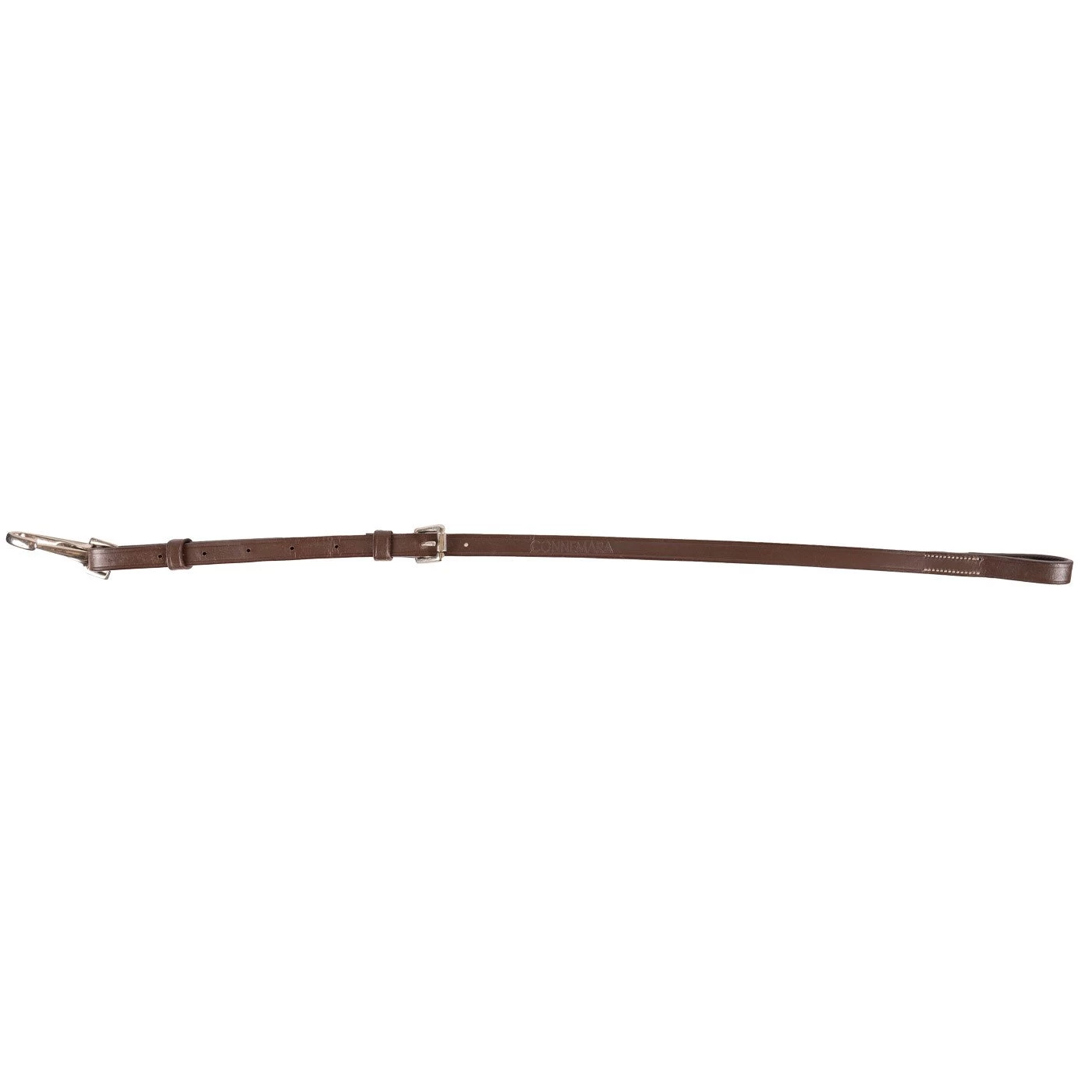 Adjustable flat leather standing martingale attachment. Design includes a snap on one end for easy attachment to the center ring of the breastplate and a loop on the other end to attach to the noseband on the bridle. Width ½ inch.