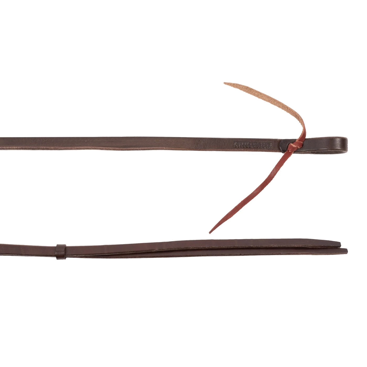 Leather reins crafted with durable Hermann Oak Harness Leather oiled and waxed by hand for a beautiful supple feel. Attaches to bit with tie ends for a traditional look. Made in Canada. 5/8” x 7’.