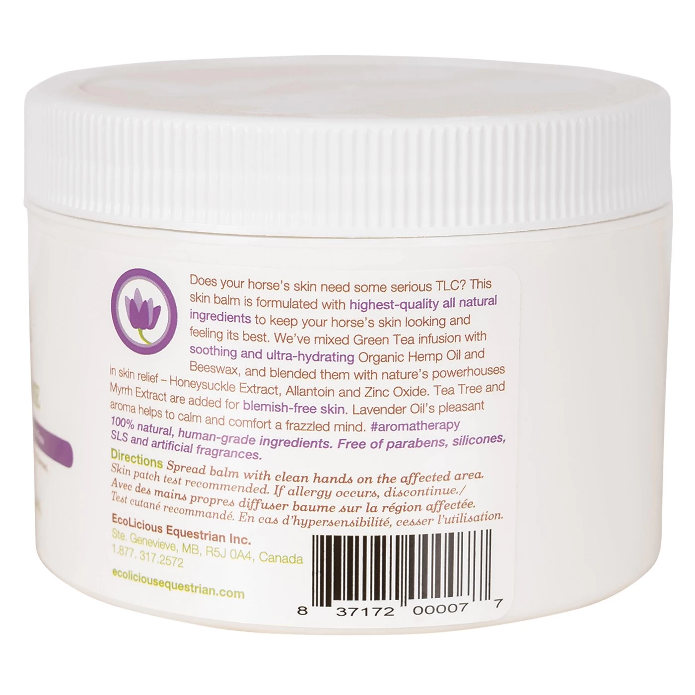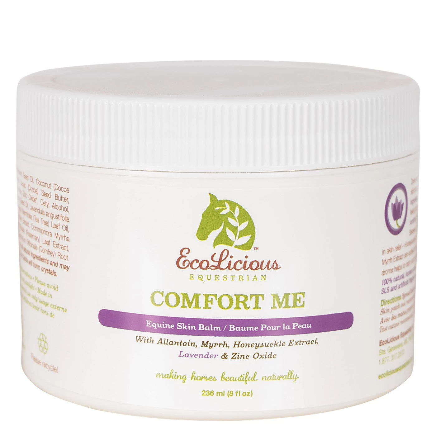 EcoLicious Comfort Me Skin Balm helps to soothe the skin. The rich formula starts working immediately and leaves behind a protective film containing essential oils. Contains myrrh, tea tree and lavender essential oils, green tea infusion, ultra-moisturizing cocoa butter, allantoin, certified organic hemp oil and honeysuckle. Packaged in 100% recycled plastic. Balm. 236mL.