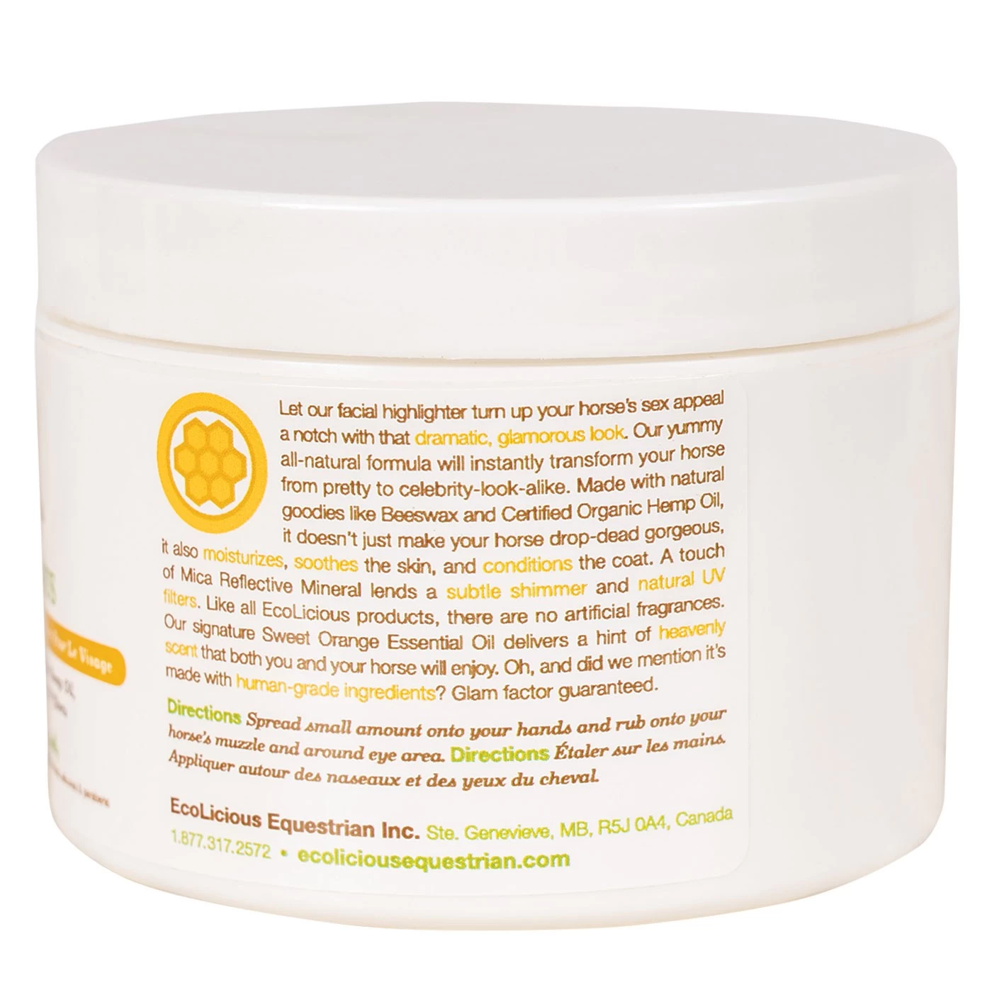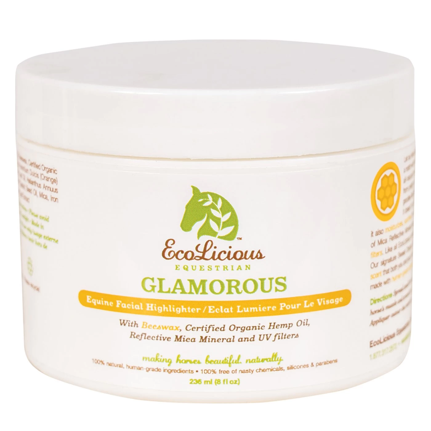 Glamorous Facial Highlighter offers that special finishing shine around the muzzle and eye area, and really turns up the drama on horses of all colors. It’s like visiting the makeup counter with your horse. Giving your horse that little extra touch of glamour before your turn in the show ring can make the difference in your score, not to mention you and your horse’s confidence level as you make your grand entrance. Glamorous uses the natural reflective power of Mica mineral to add shimmer with the added bonus of natural shield from harmful UV rays. Beeswax and certified Hemp Oil moisturize and soothe the skin and coat, while Sweet Orange Essential Oil makes it smell heavenly. Like all of EcoLicious Equestrian’s grooming products, ingredients are all natural and environmentally friendly and are human grade so are safe to use on people and animals. There are no toxic ingredients or silicones that give slick shine but are petroleum based. A touch of Glamorous on your shoulders, arms or gams will glam you up too. Packaged in 100% recycled plastic.