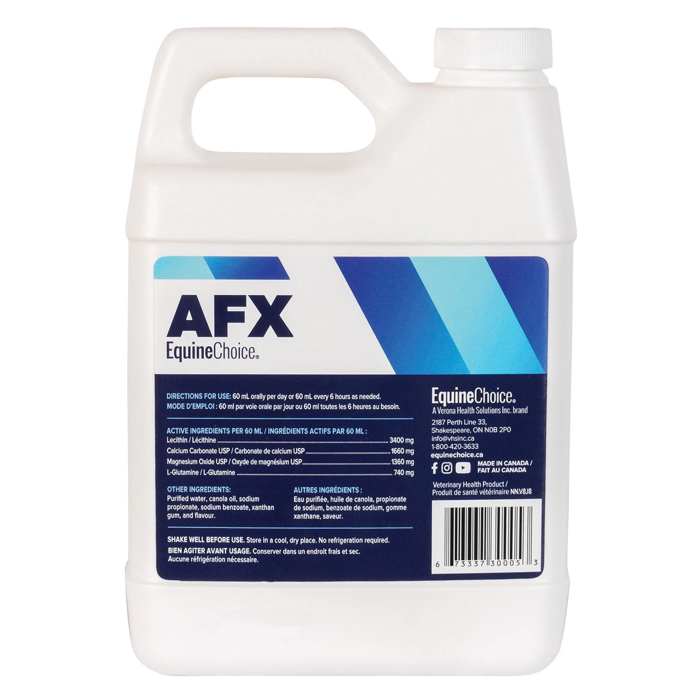 Equine Choice AFX contains mineral ingredients, Lecithin, and L-glutamine to support healthy gastric function in horses. Liquid suspension. 1L.