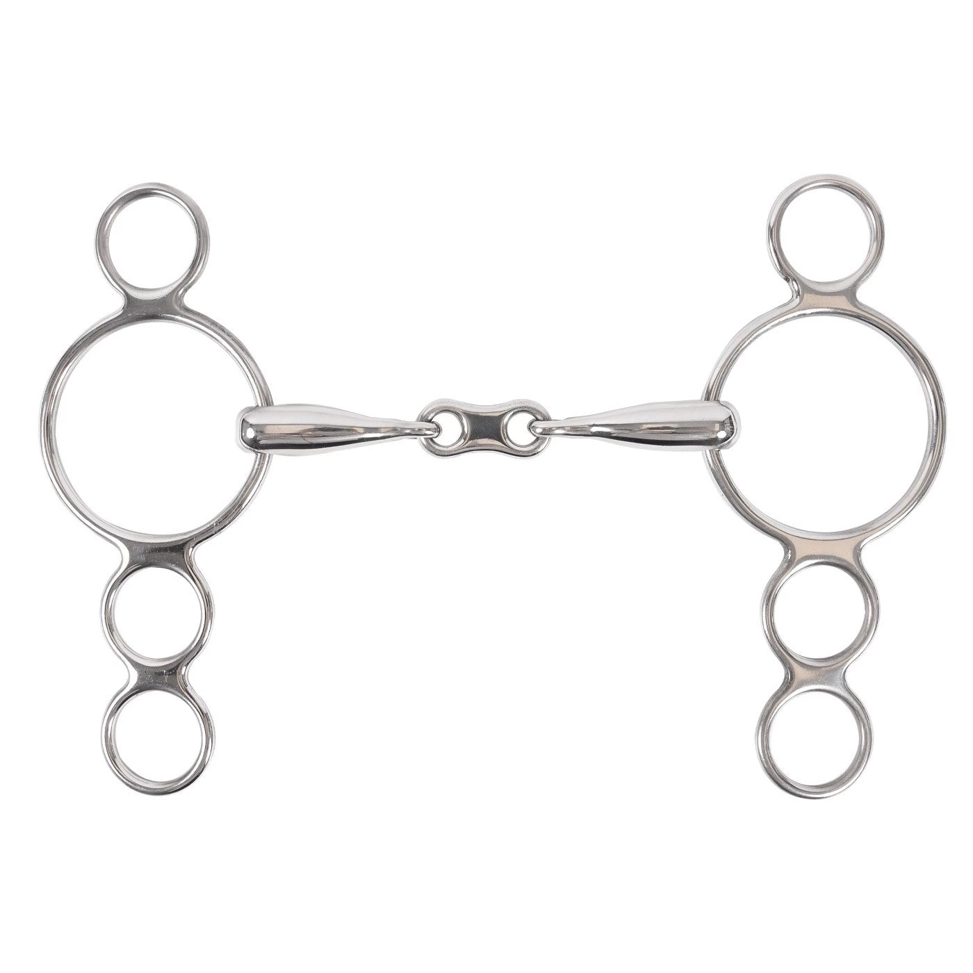 Crafted in stainless steel, the EvoEq Loose Ring French Link Elevator Bit features three-ring elevator cheeks to offer a variety of rein placement options depending on the amount of leverage required. The double-jointed French link mouthpiece features a short middle link to help reduce pressure on the roof of the mouth and can help to lessen the ‘nutcracker’ effect on the lower jaw.