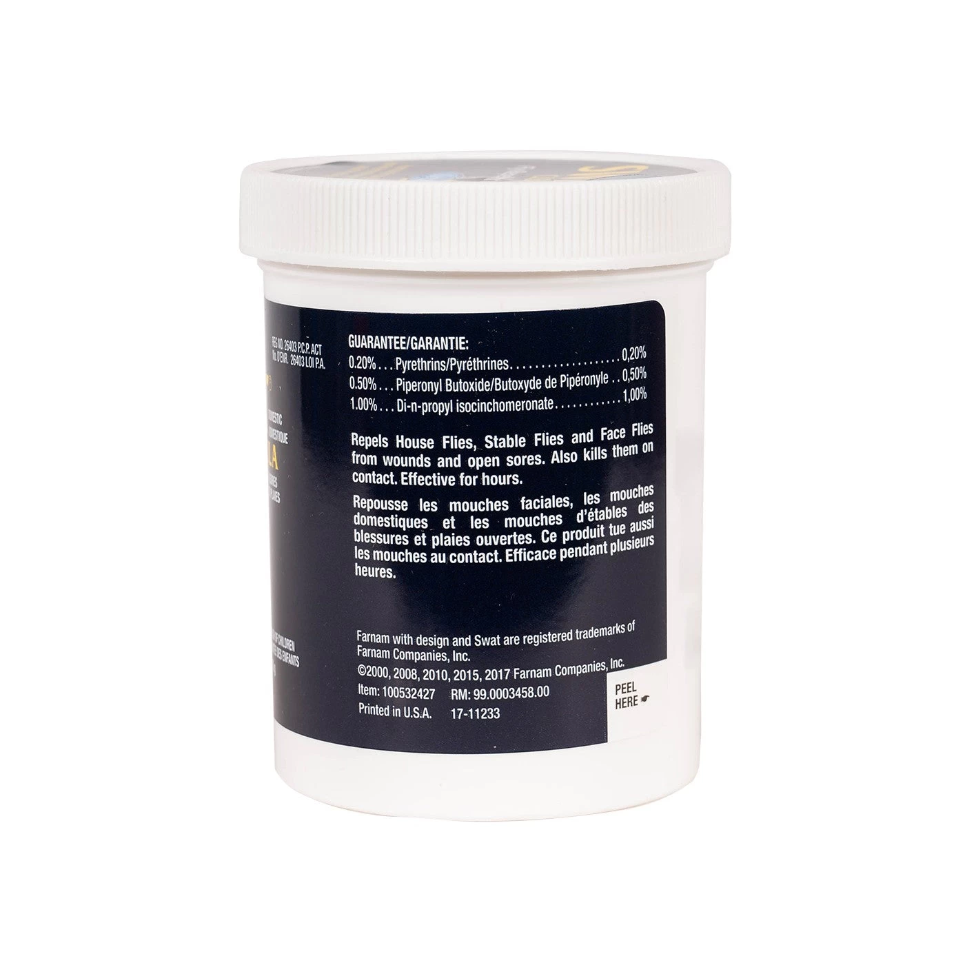 Formulated for use around wounds, sores, scratches and abrasions, Swat ointment is your go-to solution. Ideal for use on sensitive, hard-to-reach areas. Repels house, stable, face, and horn flies for hours. Apply daily for effective control against flies. Clear formula. 170 g.
