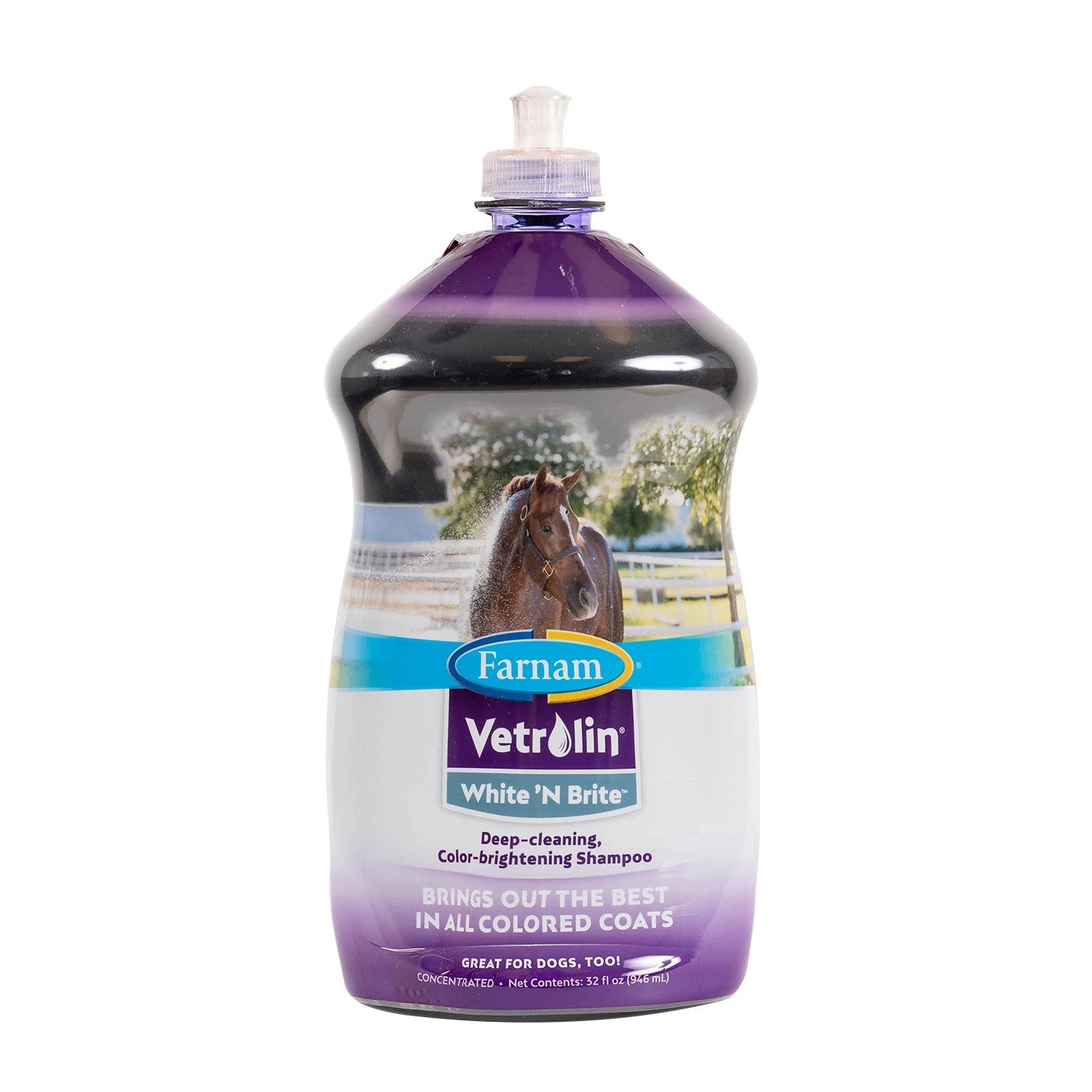 Vetrolin White ’N Brite Shampoo brings out the best in all colored coats. This deep-cleaning, color-brightening shampoo adds incredible brilliance to coats, manes and tails, while leaving your horse soft and shiny. Optical brighteners reflect light off the hair to accentuate the coat’s radiance. The gentle formula contains coconut oil derivatives to moisturize and increase absorption of brightening agents. This shampoo is an excellent spot remover, destroying even the worst manure stains quickly and easily. Concentrated formula that washes up to 16 horses. Great for dogs too! Packaged in a convenient squeeze bottle. 946 mL.