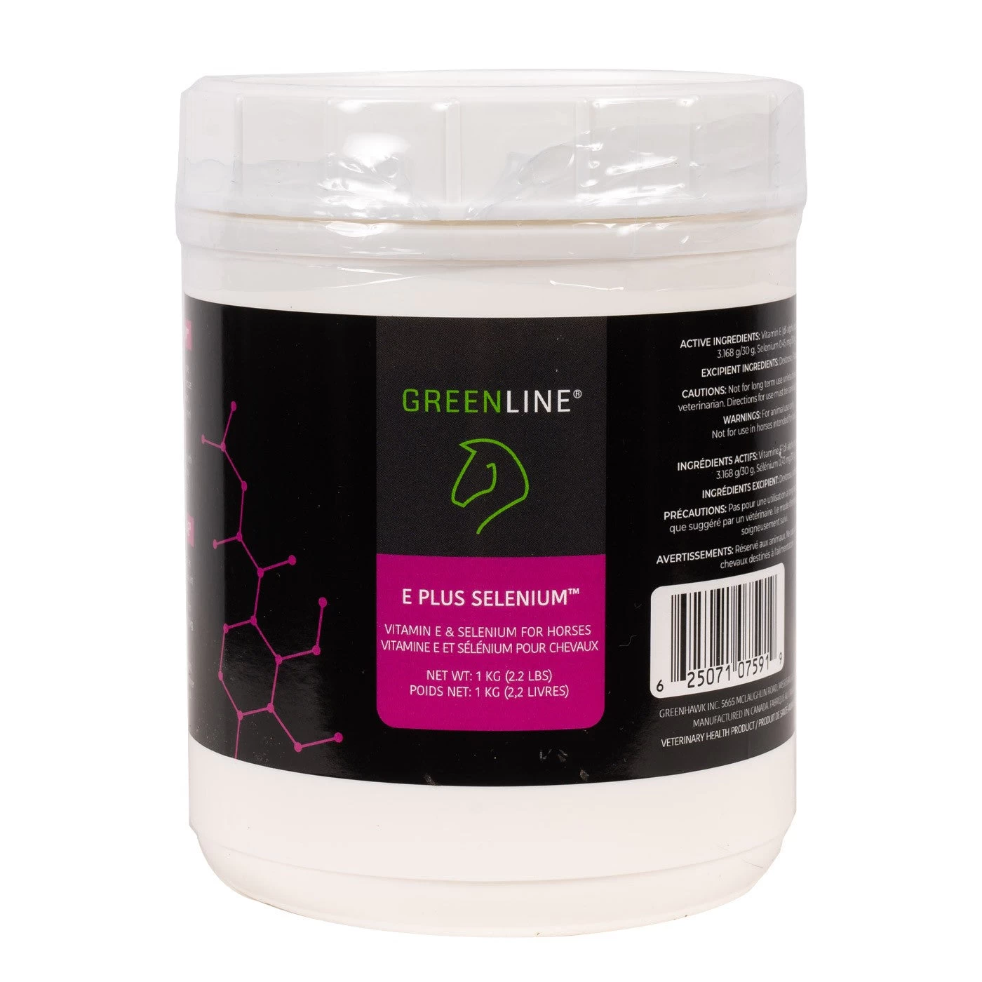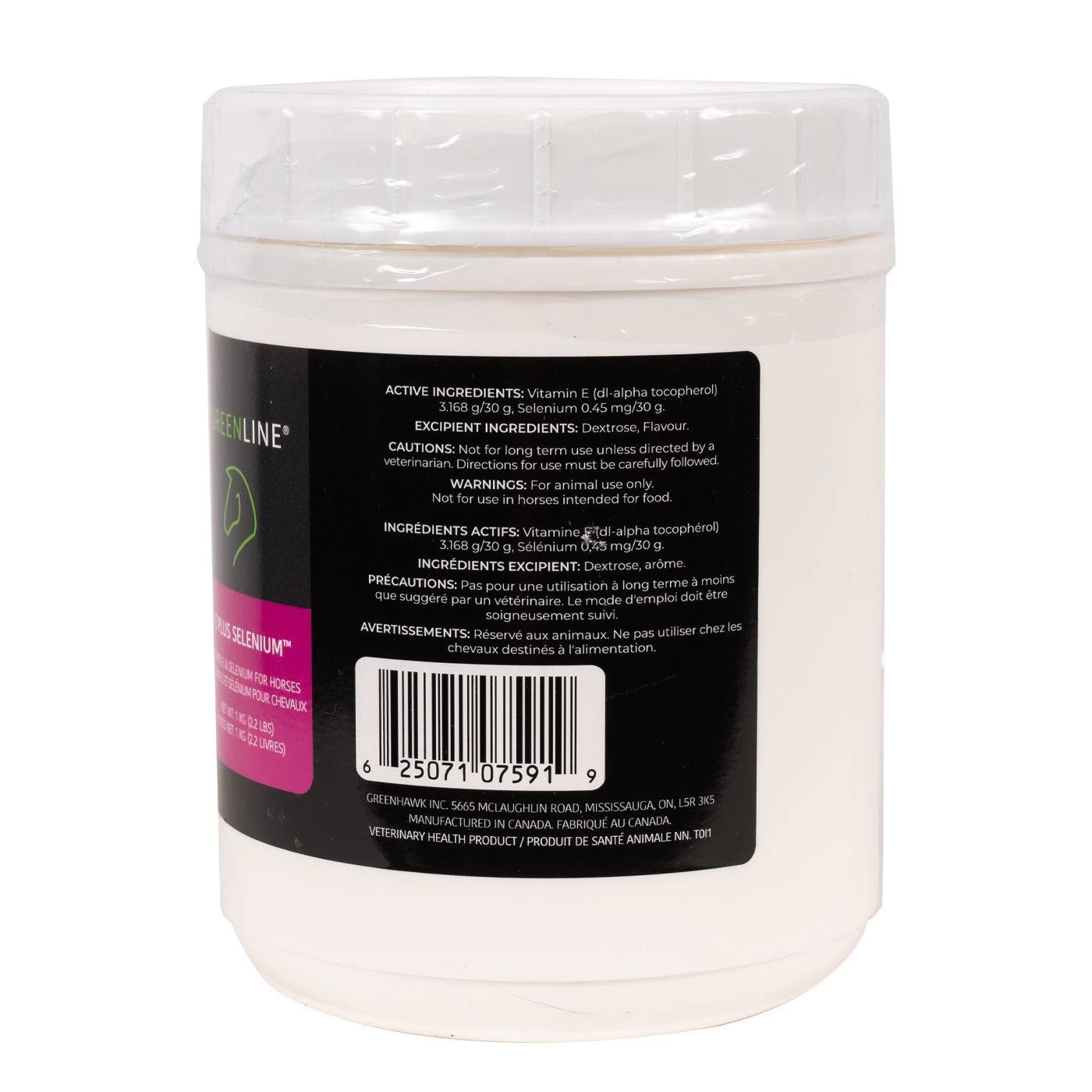 Greenline is the leading supplementation program at racetracks and competitive barns across Canada. Greenline E Plus Selenium contains 3168 IUs of Vitamin E with added Selenium in each 30 gm dose. Greenline E Plus Selenium helps maintain supple, healthy muscles in horses, especially after exercise. E Plus Selenium also helps to maintain a healthy immune system and functions as an antioxidant in the cell. Proudly manufactured in Canada. Packaged in a convenient resealable tub. Powder. 1 kg.