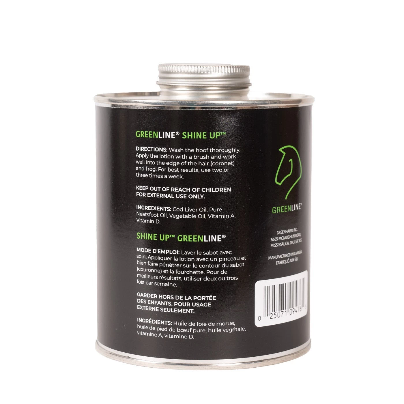 Keep your horse’s hooves in tip top shape with Greenline’s Shine Up Hoof Topical! This easy-to-use hoof dressing helps to keep hooves pliable and beautiful year round. Adds a sparkling shine to hooves when applied. Perfect for your barn or ringside kit. Packaged in a convenient metal screw top container. Brush applicator not included. Manufactured in the USA. 946 mL.