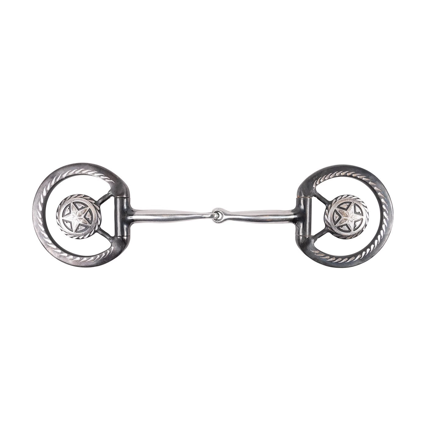 The Metalab Antique Offset Dee Ring Bit W/ Concho is a stainless steel bit featuring a single jointed, slightly curved mouthpiece. The single jointed mouthpiece creates tongue pressure. The dee ring cheeks will not slide through the horse’s mouth. The offset dee applies pressure to the lip on the opposite side of the horse’s mouth when the rein is pulled making it a great choice for horses who struggle with steering or connection through turns. Antique finish cheeks add a touch of flair. Complete with a decorative engraved concho in the center of each cheek. Direct action, no leverage.