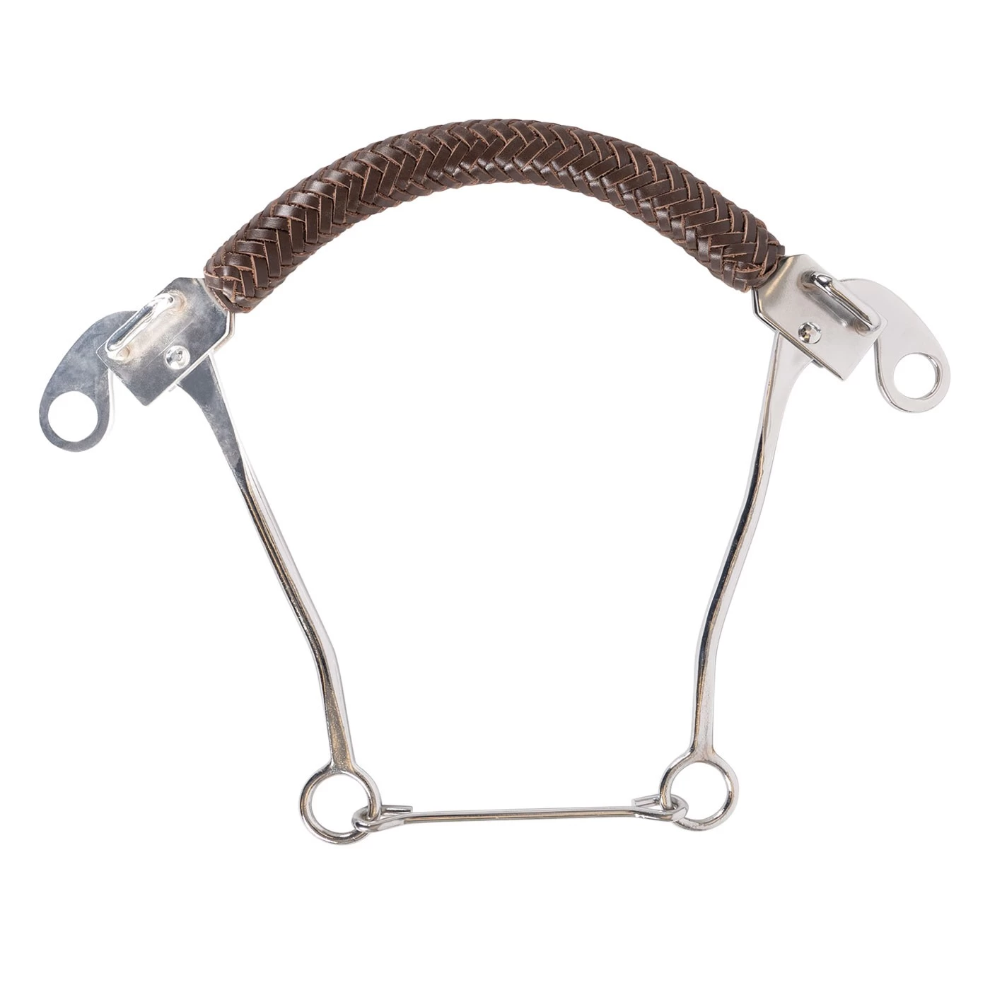 The Metalab Braided Leather Hackamore is a great choice for horses who dislike the feel of a bit in their mouth. This hackamore offers excellent leverage and control without the use of a traditional bit. Features a leather braided nose that measures 3″ in circumference. The shanks measure 9″L with a small bar at the end.