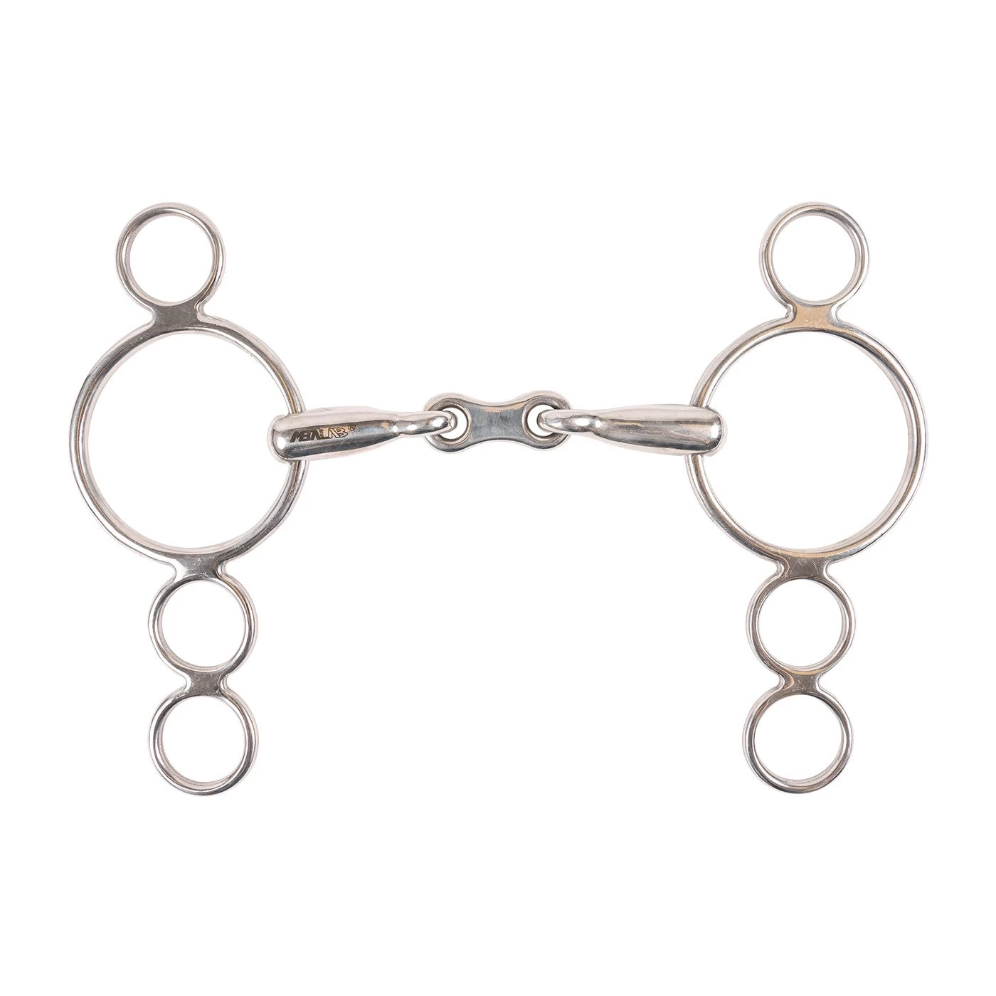 Crafted in stainless steel, the Metalab Loose Ring French Link Elevator Bit features three-ring elevator cheeks to offer a variety of rein placement options depending on the amount of leverage required. The double-jointed French link mouthpiece features a short middle link to help reduce pressure on the roof of the mouth and can help to lessen the ‘nutcracker’ effect on the lower jaw.