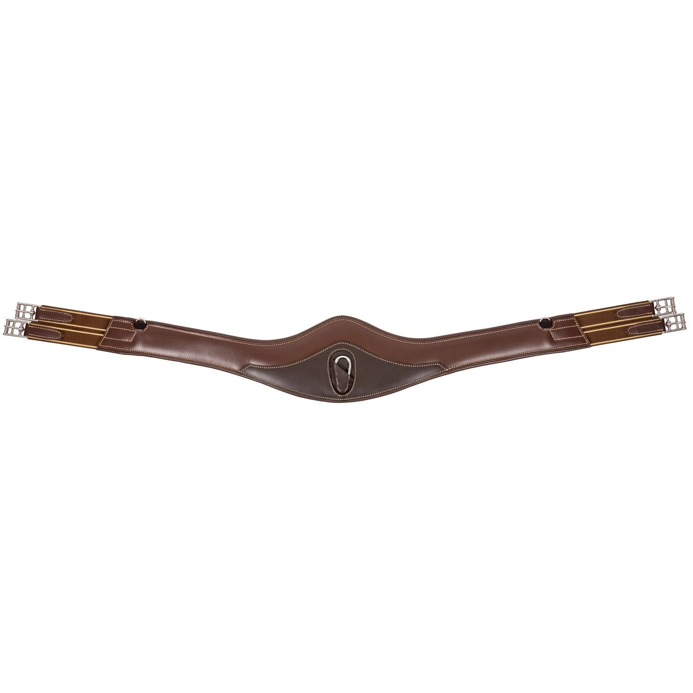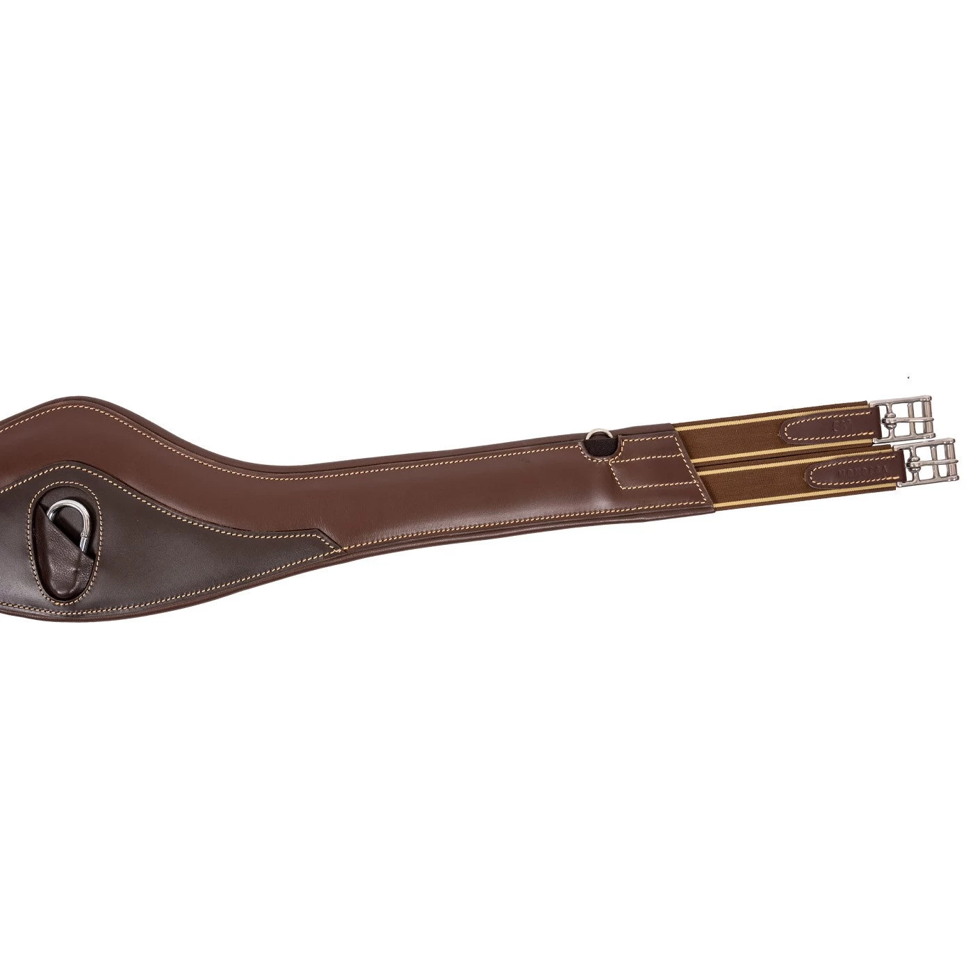 Trendy two-tone ergonomically shaped overlay girth designed for optimal distribution of pressure. Crafted with beautiful quality leather, maintaining a traditional look, with streamlined stitching adding a touch of elegance. Strategically placed padding offers the utmost comfort for your horse. Dual elastics on each side with roller buckles make tightening the girth easier both in and out of the saddle. Multiple attachment points accommodate most training aids. Finished with quality, durable hardware.
