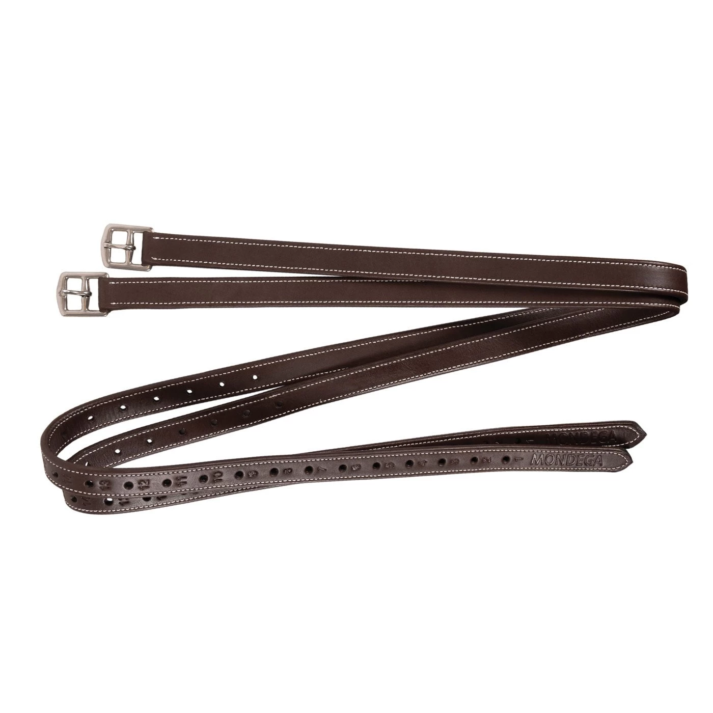 The Mondega Stirrup Leathers help to elevate your saddle with a 1″ wide construction for comfort. Features a nylon reinforcement for added durability, and contrast, single row stitching for added elegance. Complete with steel buckles.