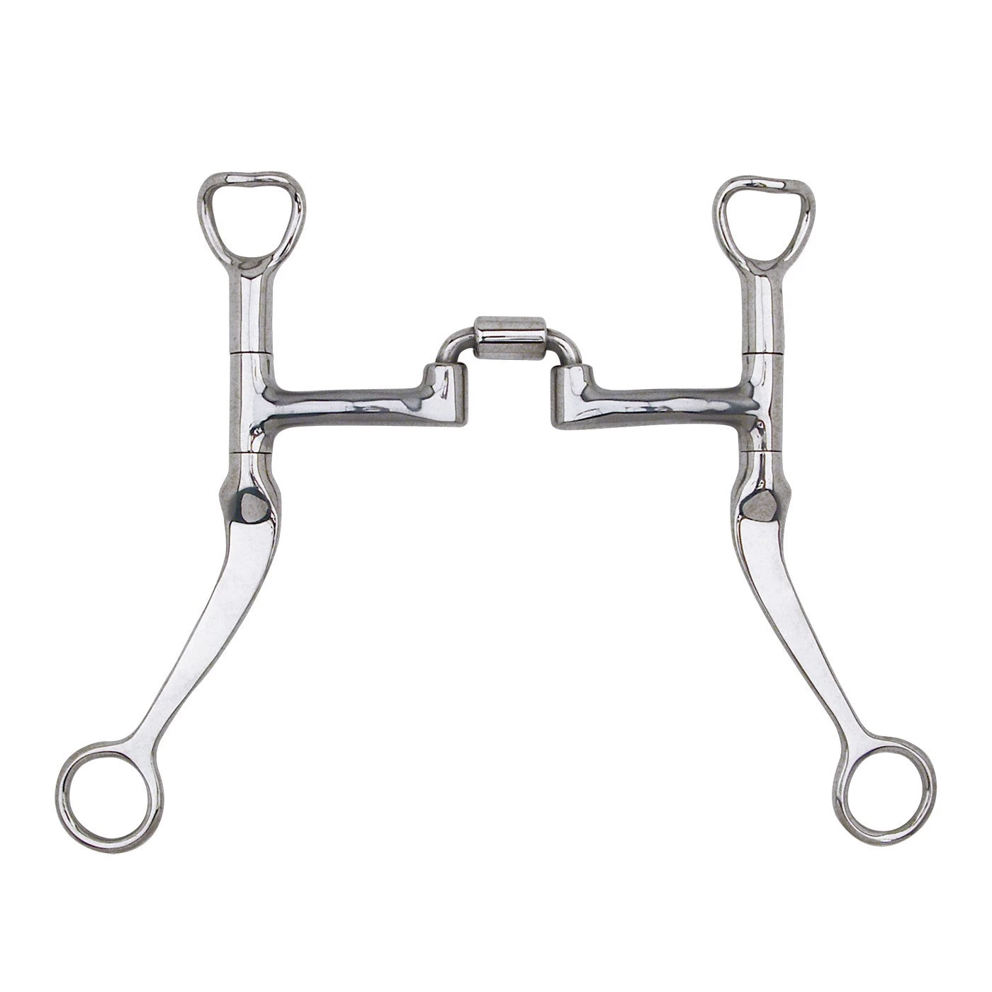 The Myler 7 in. Flat Shank Bit W/ Sweet Iron Correctional Low Port features an MB 27PB mouthpiece. The MB 27PB is a Myler correctional mouthpiece, which is a ported mouthpiece that collapses onto the outer lip and bars, and rotates on to the tongue. The port although narrow and somewhat low, allows room for the horse’s tongue to pass under the bit. When the reins are engaged and the mouthpiece rotates on to the tongue, it applies two concentrated points of pressure on the tongue for quick control. Because this port is only 1 ¼” high, it will apply little to no palate pressure. Sweet iron mouthpiece oxidizes and encourages salivation. The 7″ Flat Shank is stainless steel and curved slightly back towards the horse, with a flat-top purchase and a rein ring. The mouthpiece has a fixed attachment. The Flat Shank has the patented Independent Swivel Cheek where the purchase, mouthpiece, and shank all move independently of each other. The purchase is slightly angled away from the cheek to avoid rubbing. It has an indirect (curb) rein action designed to be used with a curb strap which attaches to the purchase. The Flat Shank uses the combination of the fixed cheek and fixed rein to apply pressure to the mouth, chin, and poll. Indirect action with moderate leverage. Myler Level 2 to 3.