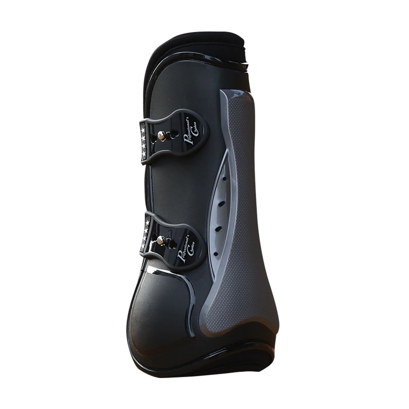 These boots feature a ventilated dual hardness outer shell which is designed to dissipate energy when the strike area is hit. The shock absorbing air cushion fits in an anatomically shaped strike area and helps to reduce the force of impact and then returns to its original shape. Features adjustable and durable TPU fasteners. Perfect for both schooling and the show ring.