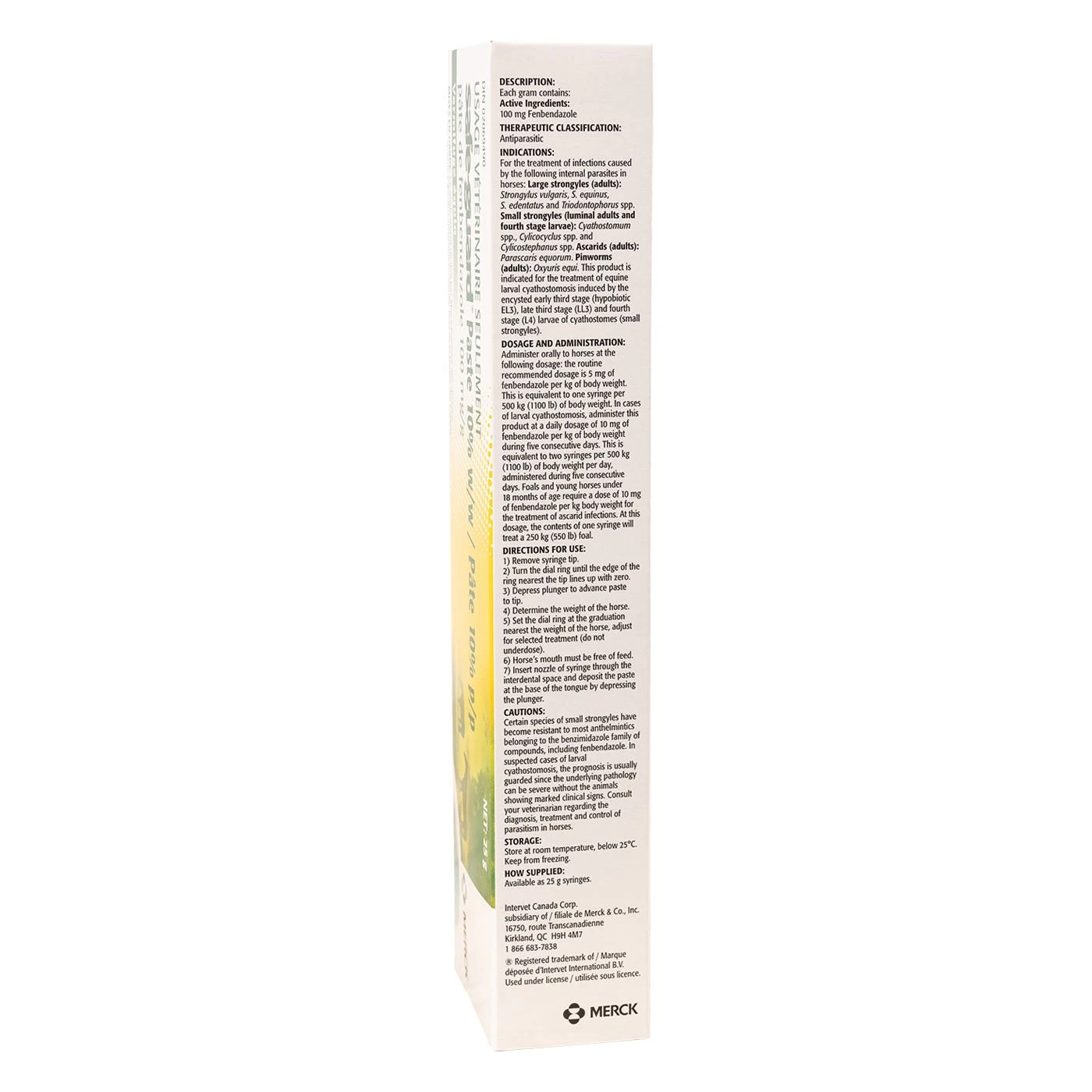 Safeguard Paste Dewormer is for the treatment of parasitic infections due to large strongyles, small strongyles, pinworms and ascarids in horses. Each gram of Safe-Guard paste contains 100mg of fenbendazole and is flavoured with a palatable base of apple cinnamon. Not available in the USA or some provinces.