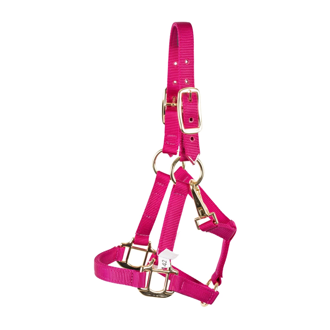 Sturdy miniature horse size halter featuring brass plated hardware and a solid brass throat snap. Single buckle crown and flat throat design provide an exceptionally comfortable fit. Reinforced stitching at all stress points for optimal durability. Complete with a throat snap for ease of use.