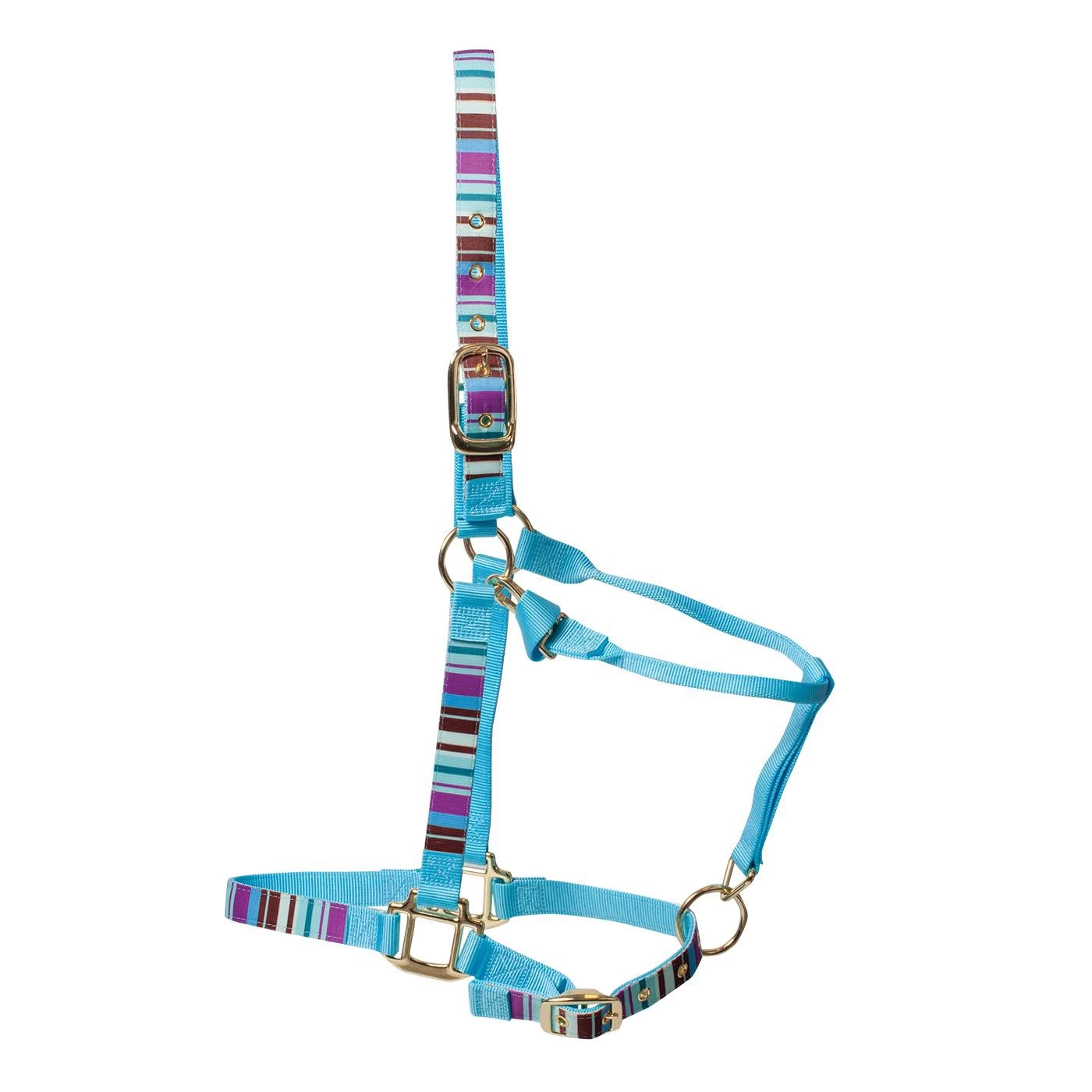 Durable nylon halter detailed with digital printed webbing decoration. Features a neat rolled throat latch and looped on durable brass plated snap for quick and convenient use. Fully adjustable crown and chin strap offer a more customizable fit for your horse.