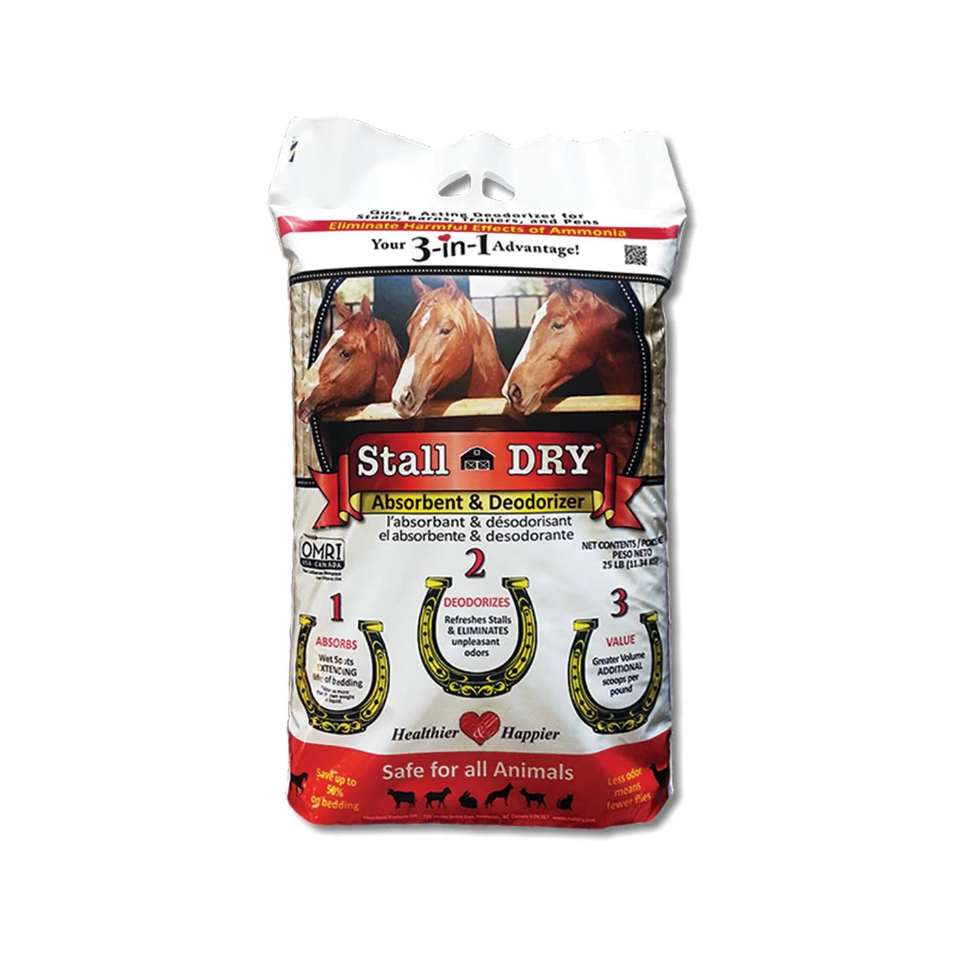 Stall DRY Absorbent & Deodorizer helps refresh horse stalls, pens and barns by reducing ammonia levels, eliminating odours and absorbing moisture. It is composed of a natural blend of food grade diatomaceous earth and clay in a granular form and, as a result, is safe to use with all animals. 11.34 kg. Due to the size of this product, an additional shipping charge will apply.