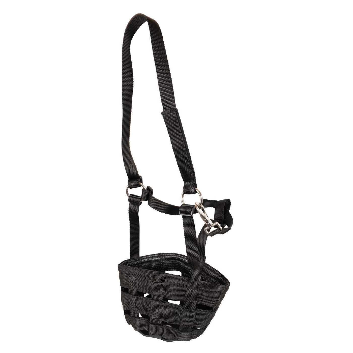 The web anti-grazing muzzel is designed to prevent over eating while still providing all day comfort. Nylon crown piece and throat latch ensure the muzzle stays in place, whether turned out or in, and is available in multiple sizes. Muzzle component is designed from nylon webbing with a rubber bottom, complete with small hole for limited access to forage.