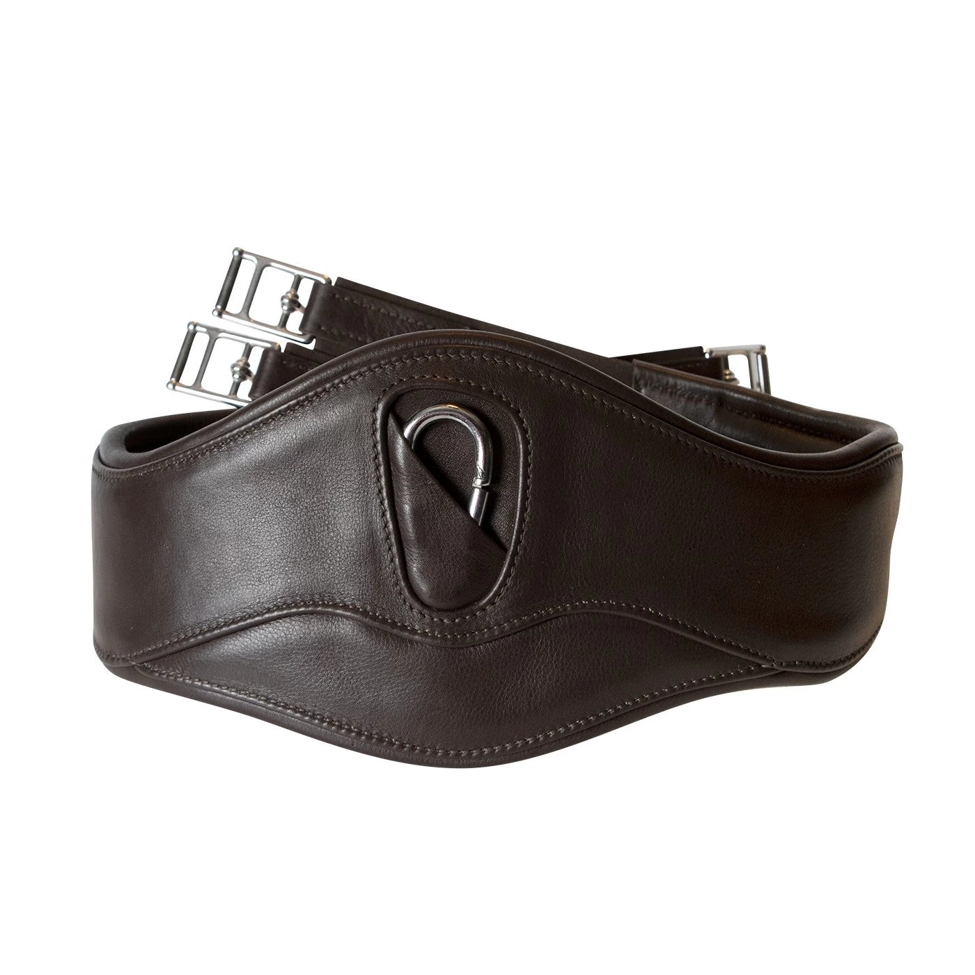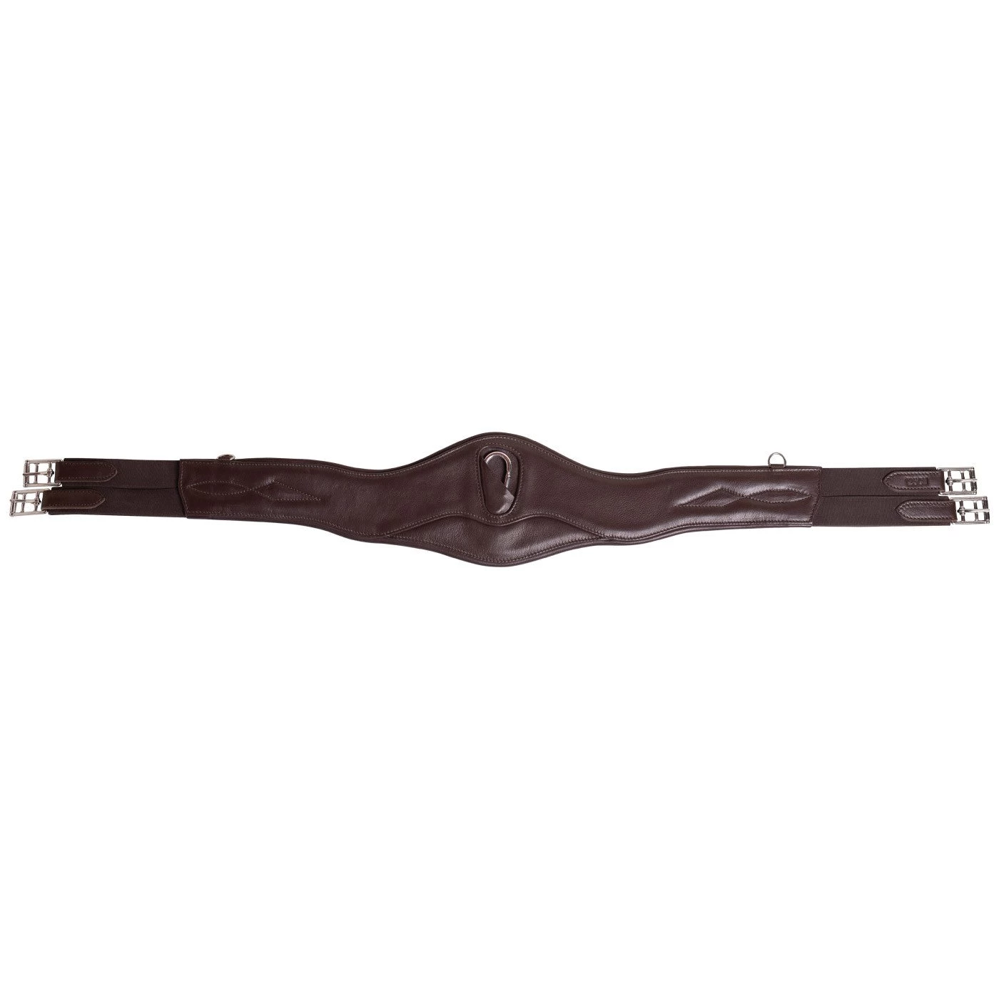 Made from high quality leather, the Val du Bois Contoured Jump girth has been designed for optimum comfort through its anatomic design. Buttery soft leather shapes easily to the horses body and with side rings for training attachments and a center clip for breastplates and martingales, this girth is the ideal choice for both every day riding and in the show ring.