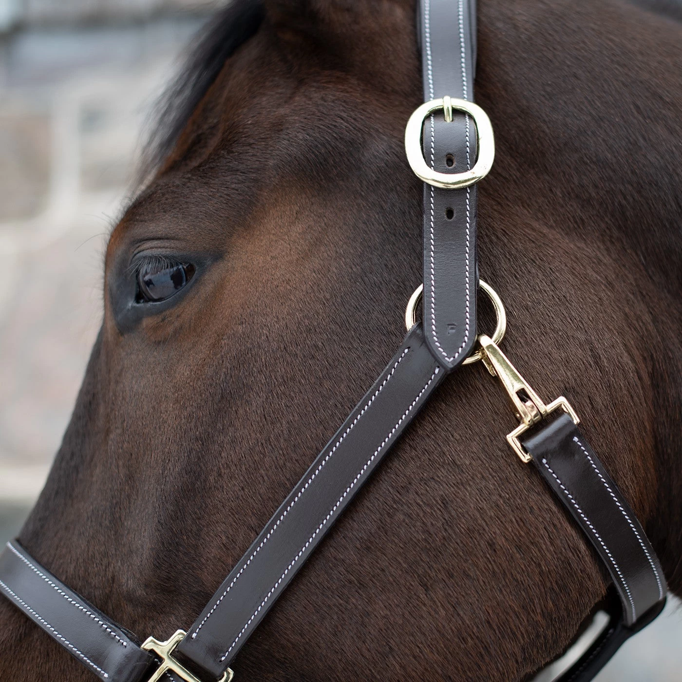 The Val du Bois Convertible Leather Grooming Halter is perfect for at the show or around the barn, allowing you to conveniently groom your horse without removal of the halter. Made from high quality leather with contrast stitching and features 3 snaps at the throat and chin. May be easily converted to a grooming halter by removing the detachable throat latch, allowing you access to more points of the horse’s face. Complete with a fully adjustable crown and nose for a customized fit.
