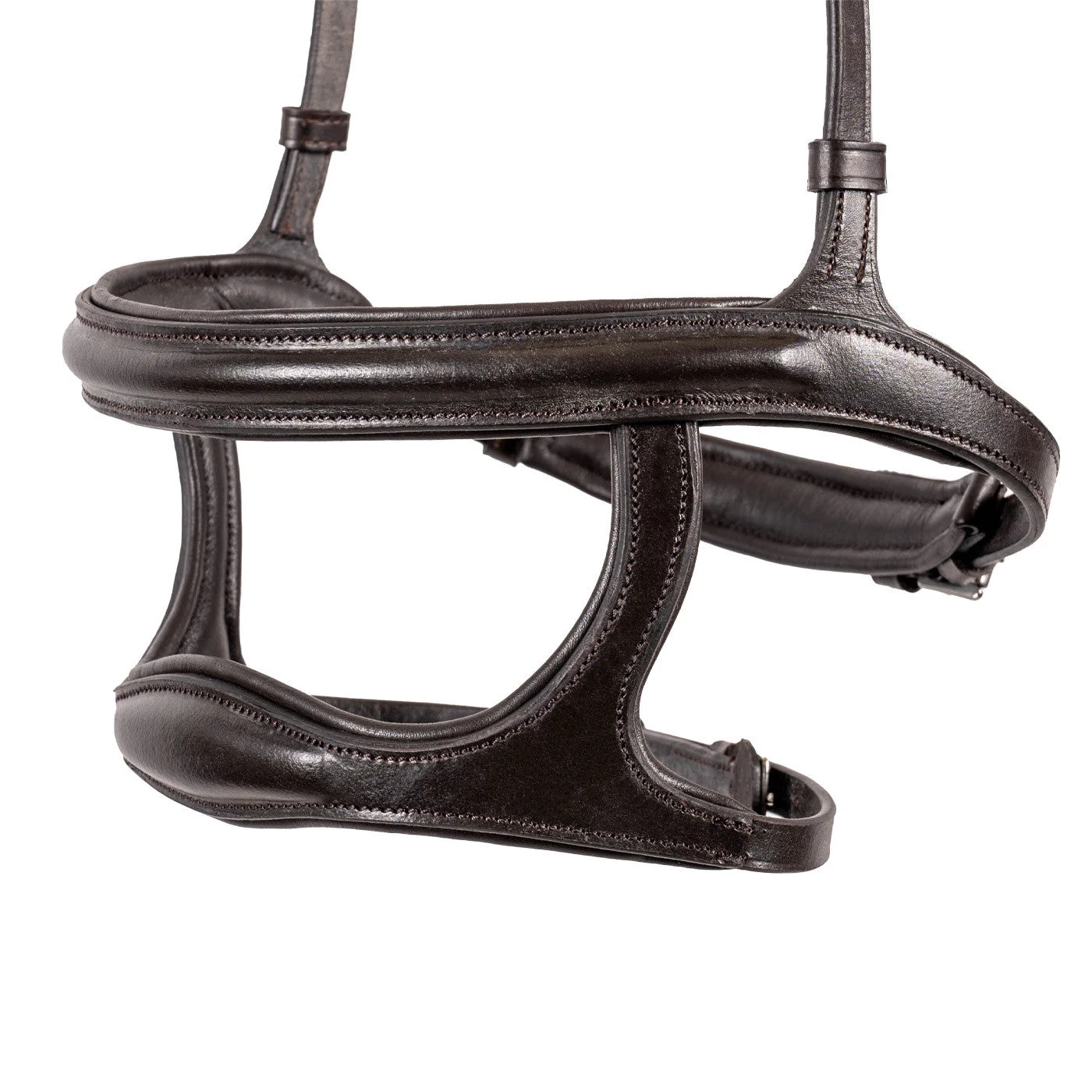 The Val du Bois Double Noseband is made from high quality padded leather and combines a cavesson and drop noseband to help control the opening of the mouth while limiting the lateral movement of the jaw. The double noseband is suitable as a training aid and may be used in competition for jumpers. Can be attached to a monocrown or regular bridle and is easily adjustable on both sides.