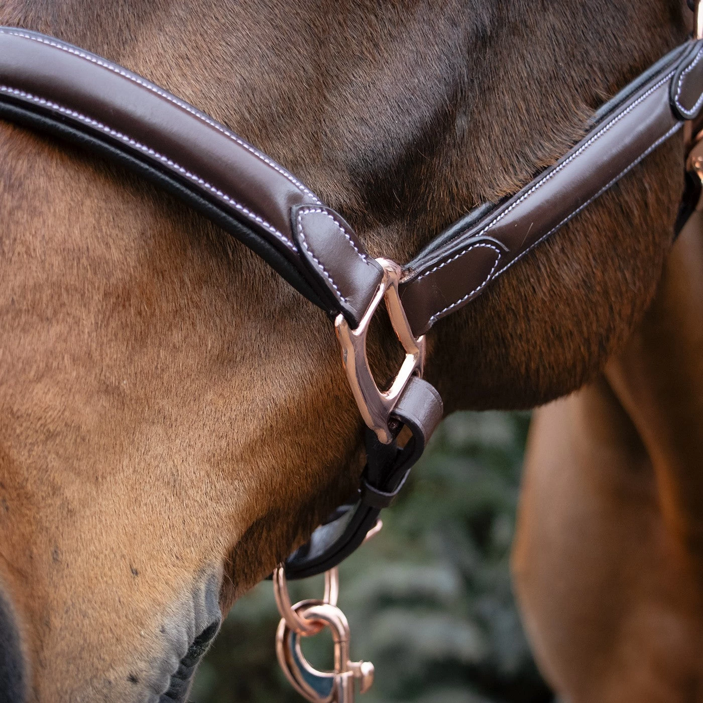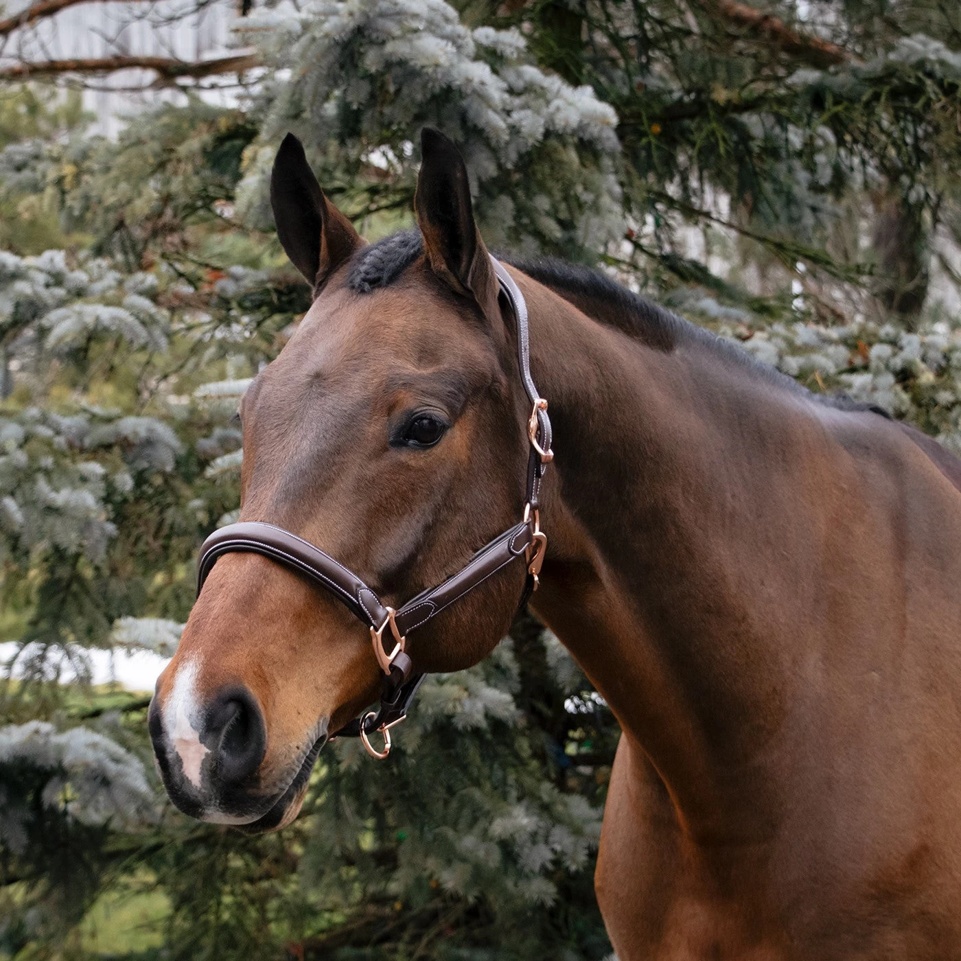 The Val du Bois Rose Gold Raised Leather Halter is carefully crafted using premium quality leather, and features a raised and padded crown, cheeks, and noseband for added comfort and style. Fully adjustable at the crown and chin for a perfect fit. Complete with rose gold hardware for an elegant, and elevated appearance.